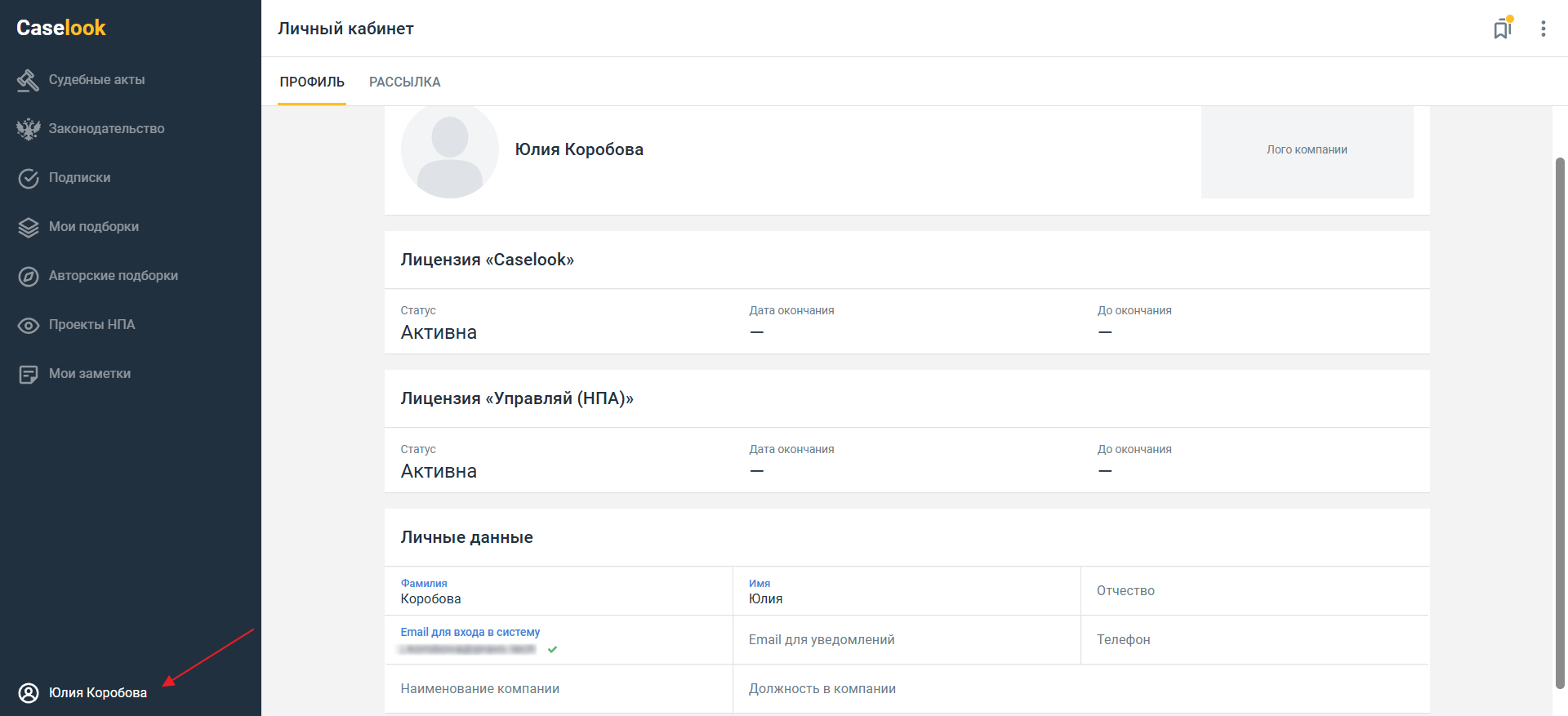Для работы с личными данными нажмите на свое ФИО в левом нижнем углу. Откроется раздел Профиль, в котором можно изменить личные данные текущего пользователя.