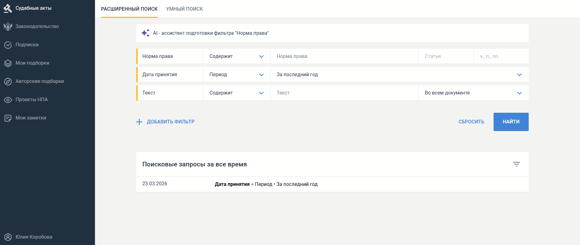 Пользователь может выполнить поиск судебных актов самостоятельно в разделе Судебные акты на вкладке Расширенный поиск. Набор фильтров для каждого пользователя формируется индивидуально и состоит из трех стандартных, установленных по умолчанию всем пользователям (Норма права, Дата принятия, Текст) и двух динамических. Добавление динамических фильтров происходит в зависимости от поисковых запросов конкретного пользователя за определенный период - автоматически добавляются два наиболее часто используемых фильтра (отображаются в порядке частоты использования, от самого частого). Значение динамических фильтров не заполняется по умолчанию.