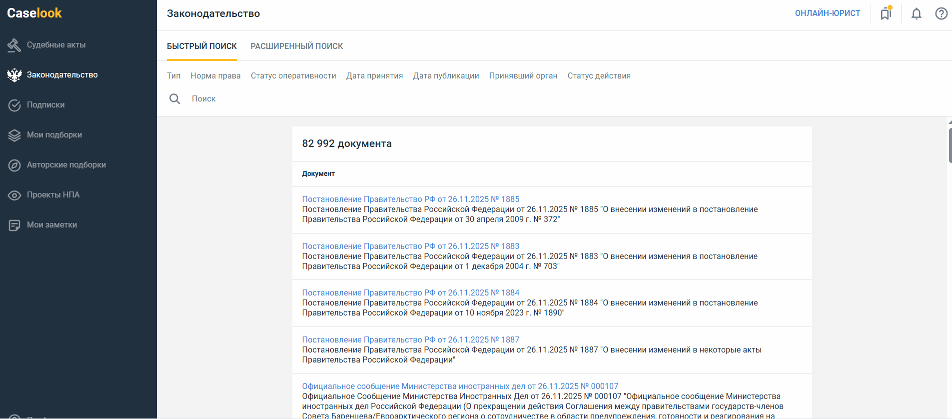 Можно найти нормативно-правовые акты в разделе Законодательство на вкладках Быстрый поиск и Расширенный поиск. Далее описаны оба алгоритма поиска.