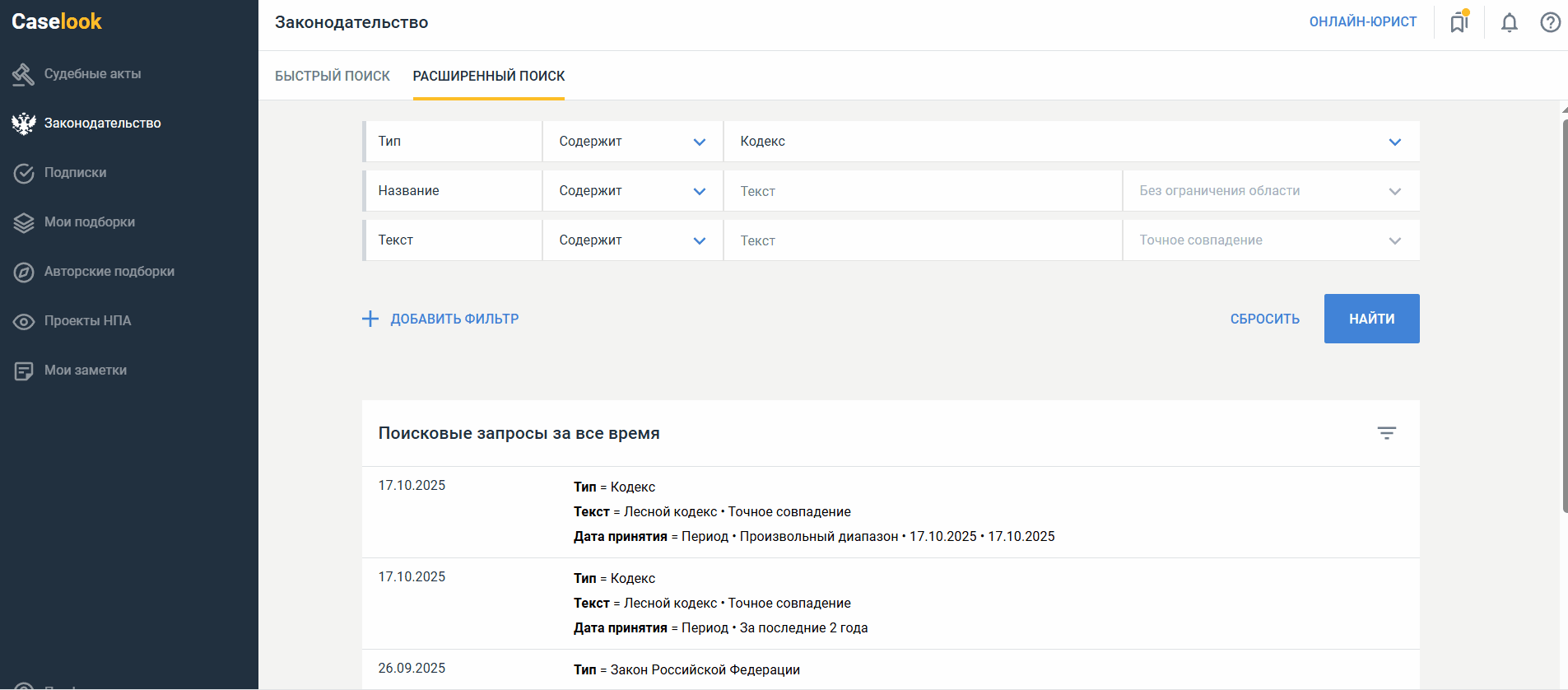 Расширенный поиск НПА выполняется аналогично поиску судебных актов: