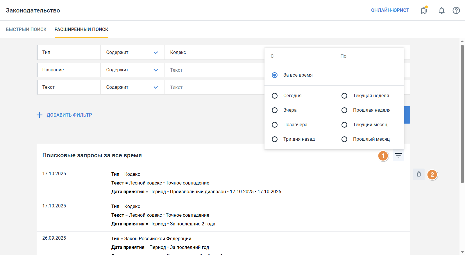 На вкладке Расширенный поиск ведется история поисковых запросов по НПА. Алгоритм работы с историей поисков такой же, как для судебных актов: пользователь может повторить любой из предыдущих поисковых запросов, либо изменить его параметры под свои требования для уточнения результатов поиска. Также можно отфильтровать запросы для быстрого поиска нужного (кнопка отмечена цифрой 1) и удалить запрос из списка (кнопка отмечена цифрой 2).