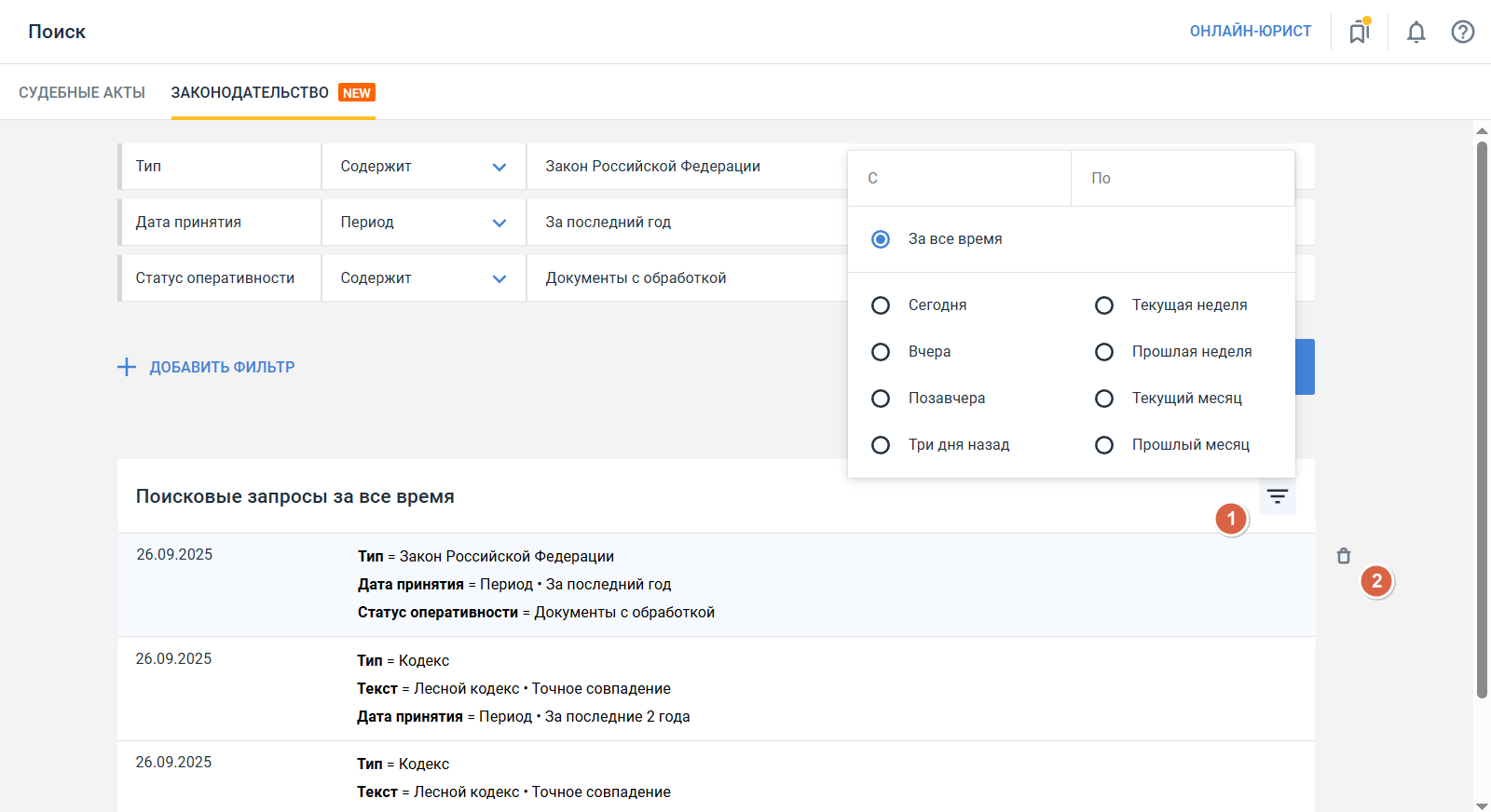 В системе ведется история поисковых запросов по НПА. Алгоритм работы с историей поисков такой же, как для судебных актов: пользователь может повторить любой из предыдущих поисковых запросов, либо изменить его параметры под свои требования для уточнения результатов поиска. Также можно отфильтровать запросы для быстрого поиска нужного (кнопка отмечена цифрой 1) и удалить запрос из списка (кнопка отмечена цифрой 2).