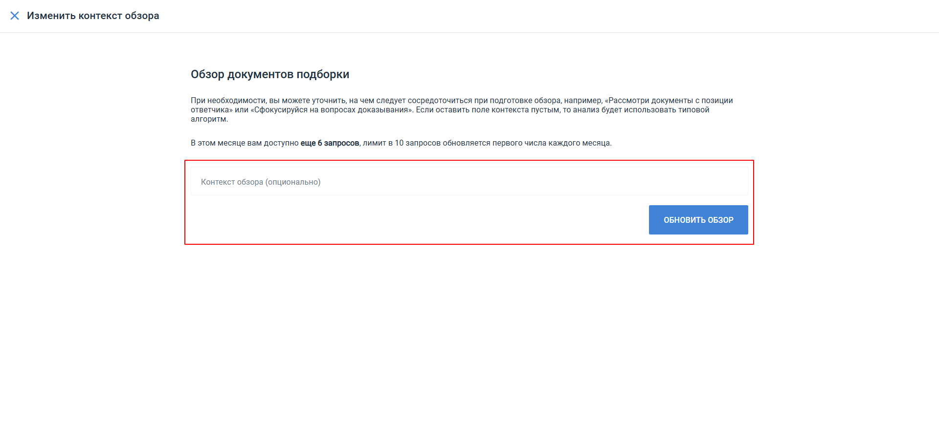 Чтобы добавить/изменить контекст для уже сгенерированного обзора, нажмите кнопку Задать контекст/Изменить в верхней части обзора. Откроется форма изменения контекста, введите новый запрос и нажмите кнопку Обновить обзор. Будет сгенерирован новый обзор с учетом введенного запроса.